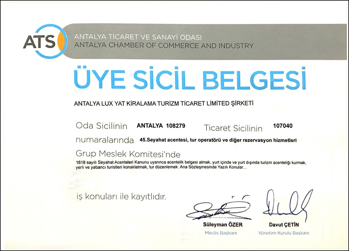 Türkiye’de resmi olarak kayıtlı olan şirketimiz tursitik aktiviteler için gerekli bütün dökümanlara, sertifikalara, patentlere ve lisanslara sahiptir.